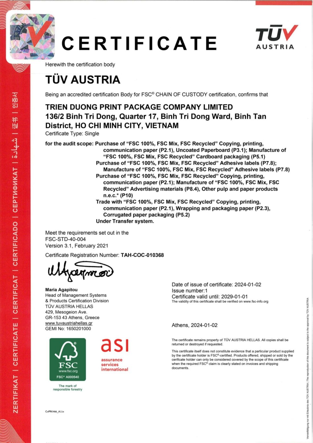 We are proud to be among the few printing companies in Vietnam certified by FSC (Forest Stewardship Council) – ensuring that our paper materials and production processes meet international standards for sustainable forest management.